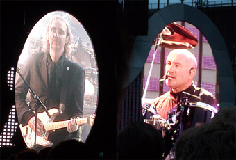 Ein richtig "alter Schuh" bzw. sogar mehrere sollten aber erst jetzt folgen. In the cage, folgten die Instrumentalstücke the cinema show und Duke’s travels sowie das ruhigere afterglow, welche als Einheit vorgetragen den nächsten Block bildeten. Die vielen Instrumentalstücke überraschten mich als einer der nicht alle Songs kennt schon, aber dafür durften dadurch auch die Protagonisten ihr Können eindeutiger zur Schau stellen. Vor allem der introvertierte Antony Banks dominierte neben Daryl Stuermer an der Bassgitarre diese Stücke, die allesamt routiniert vorgetragen wurden. Unterdessen wurden die extra für diese Tour ins Bühnenbild eingearbeiteten Leinwände immer häufiger für optischen Zucker genutzt. Neben bloßen Projektionen der Protagonisten wurden auch Sequenzen aus alten Musikvideos und animierte Figuren über die Großleinwand gejagt, die die Deutung der Lieder beeinflussen sollten. Schön anzusehen war es jedenfalls. Ebenfalls auffällig war der häufige Positionswechsel vom agilen Phil Collins, dem hiernach die nächsten Fitnessstunde erlassen werden konnte. Selbst inmitten den Songs ließ er es sich nicht nehmen zwischen seinem Schlagzeug und dem Mikrofon am Bühnenrand hin und her zu pendeln.