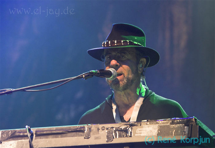 Nach dem wiederum lautstarken Beifall gab es eine Art Bühnenshow von MMEB. Während sich Mick zum rechten Bühnenrand orientierte, ging Steve Kinch zum Drummer Geoff Dunn und Noel rüber zu Manfred himself. Ergo war der Großteil der Bühne leer und man wartete gespannt, was denn nun folgen würde. Mick verstieg sich wieder in einen Gitarrenpart, der dann langsam in blinded by the light überging (und sofort wiederum stürmischen Beifall aus pitschnassen Händen einbrachte). Alle machten schön bei diesen 12 Minuten mit und Mick & Noel wechselten sich auch hierbei häufig am Mikrophon ab, während die begeisterten Zuschauer leidenschaftlich den Refrain mitgrölten/mitsangen.